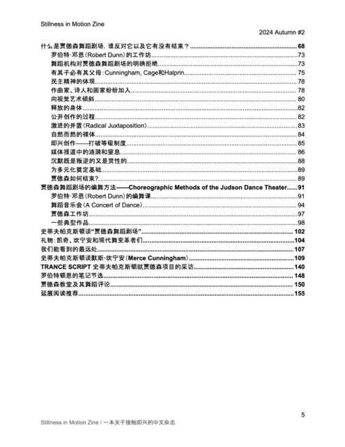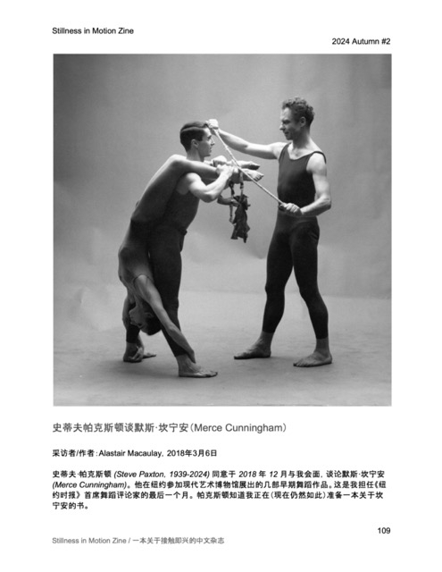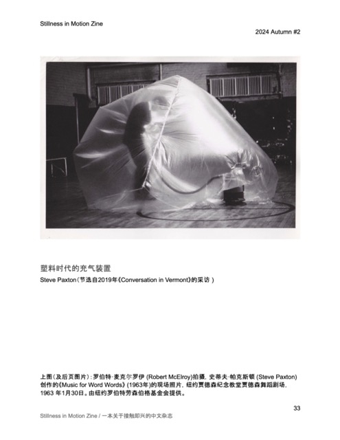 This publication (156 pages, about 140000 words) includes a selected Chinese translation of writings and essays on Steve Paxton's early work, from Judson Dance Theater era to the birth of Contact Improvisation, 1961 to 1969.