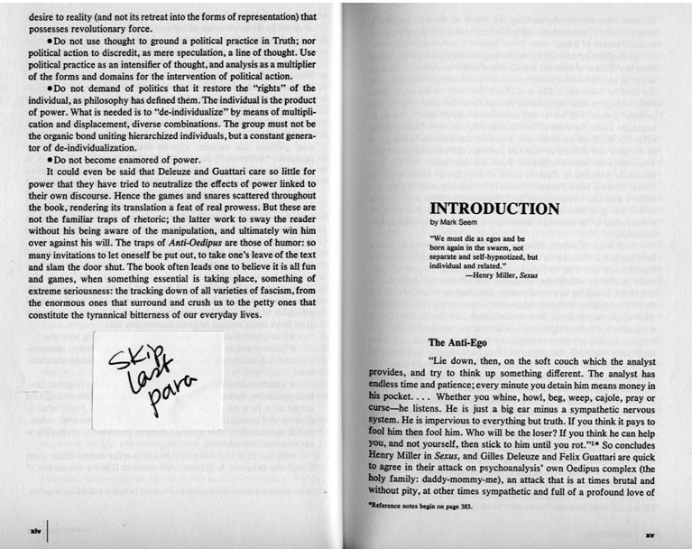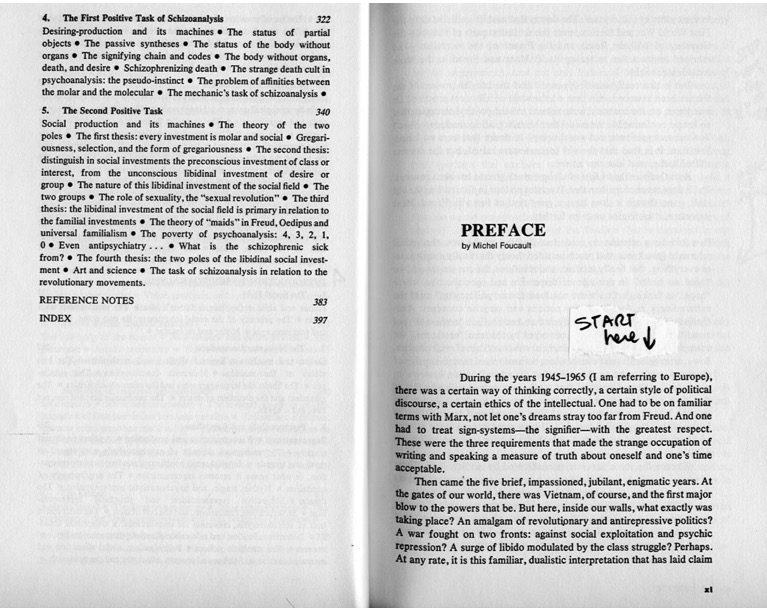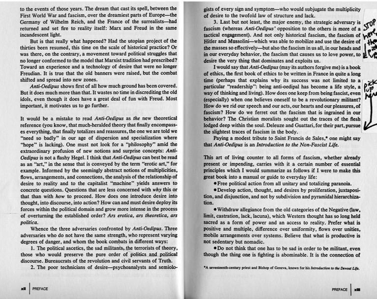I am also referring the original idea of non-fascism way of life, from Michel Foucault’s Preface to Anti-Oedipus. This book by Gilles Deleuze and Félix Guattari is the first volume of a larger book titled Capitalism and Schizophrenia. Anti-Oedipus is published in 1972, exactly the same year of the birth of Contact Improvisation. You can read a photocopy of this short essay by Foucault below, or move with the audio.